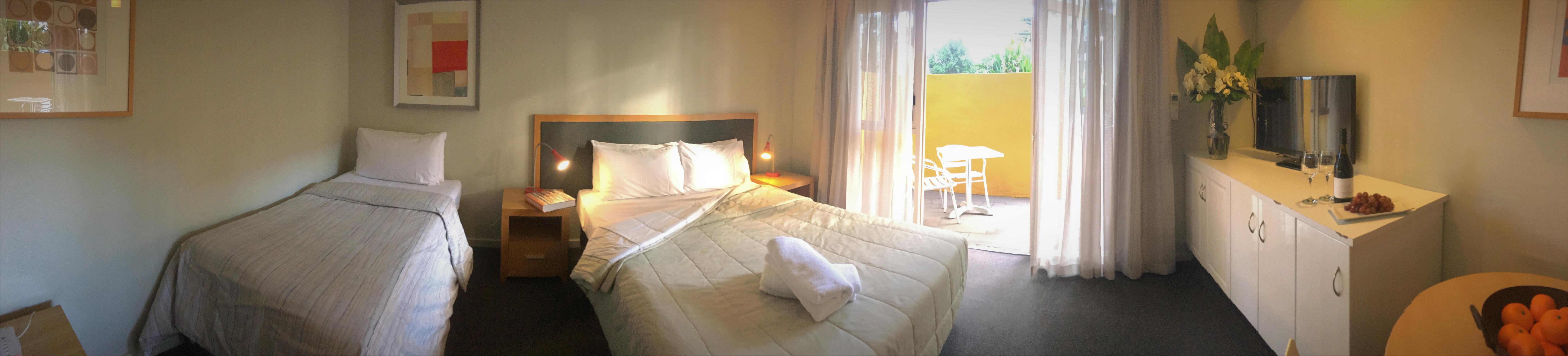 Ground level room with adjacent car parking space. The room is in similar size and bedding configuration as the Twin Share rooms, with a queen and a single bed. The room contain walk in shower and a furnished small patio.